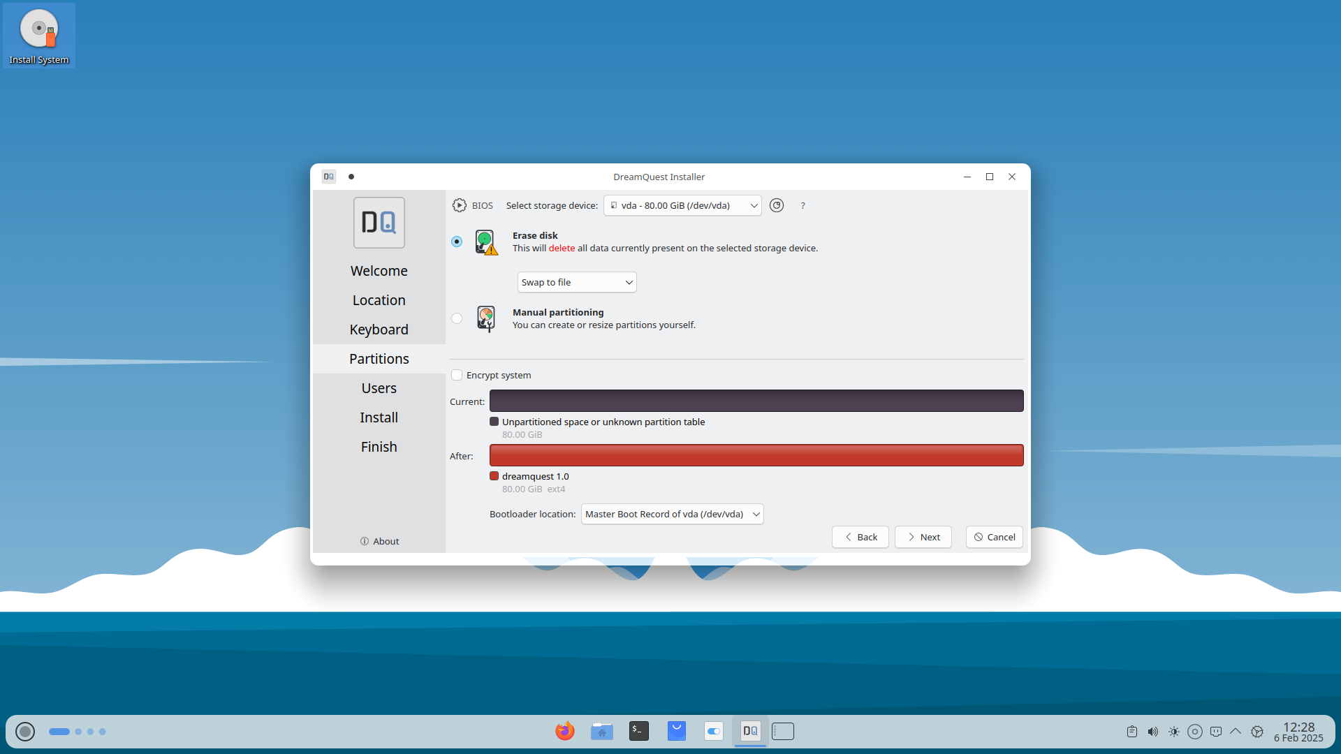 Choose :Erase Disk (Recommended for a fresh install) → Wipes the entire disk and installs DreamQuest 1.0.