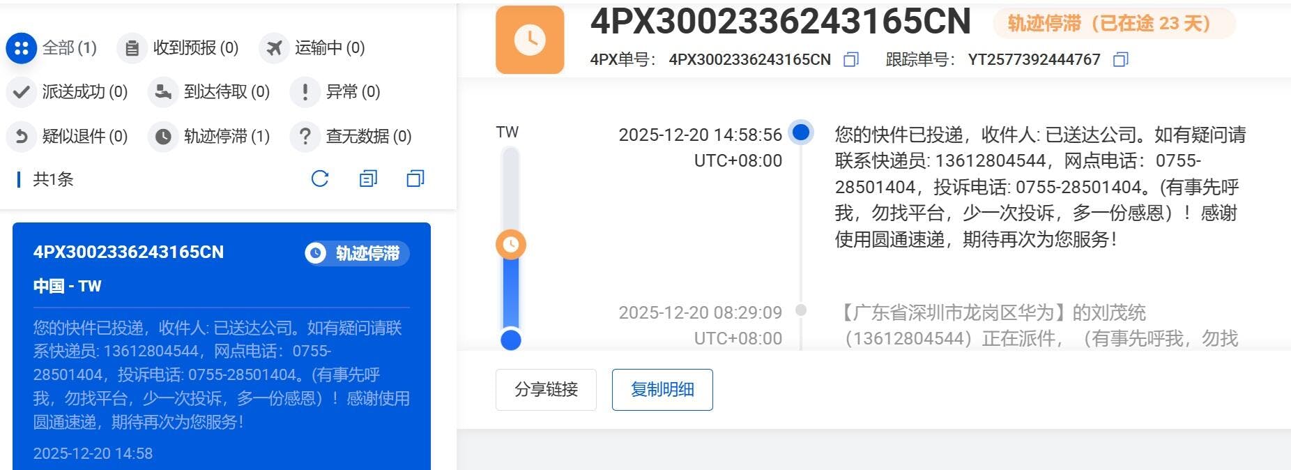 I have checked the tracking information, and the order status shows an abnormal result. Please find the tracking link below for your reference: